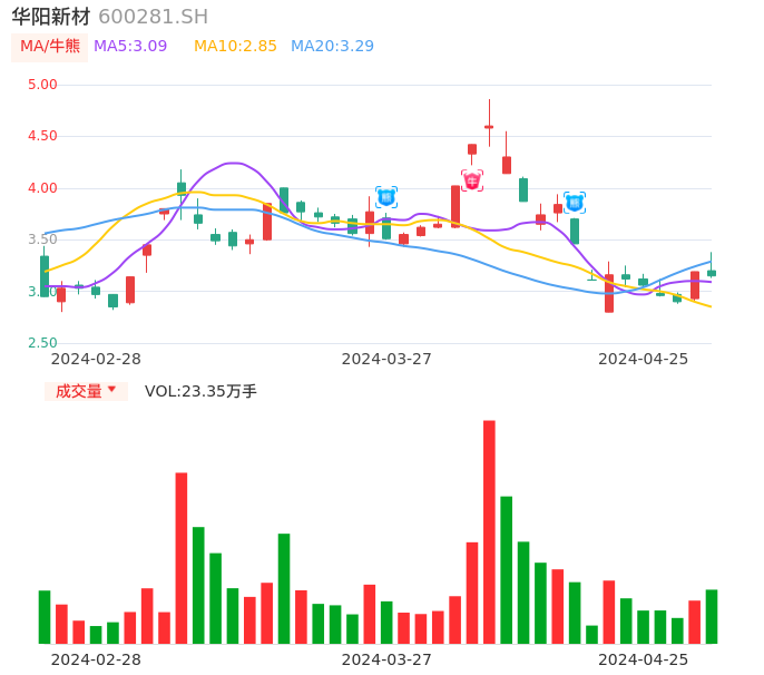 04月25日,华阳新材收报3.15,股价涨幅-1.25%,成交金额7496.31万元,换手率4.54%。