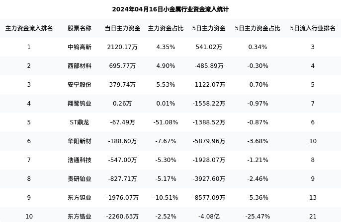 从主力资金流向来看,小金属行业今日主力资金流入40.31亿元,在所有申万二级行业中排名:92/131。