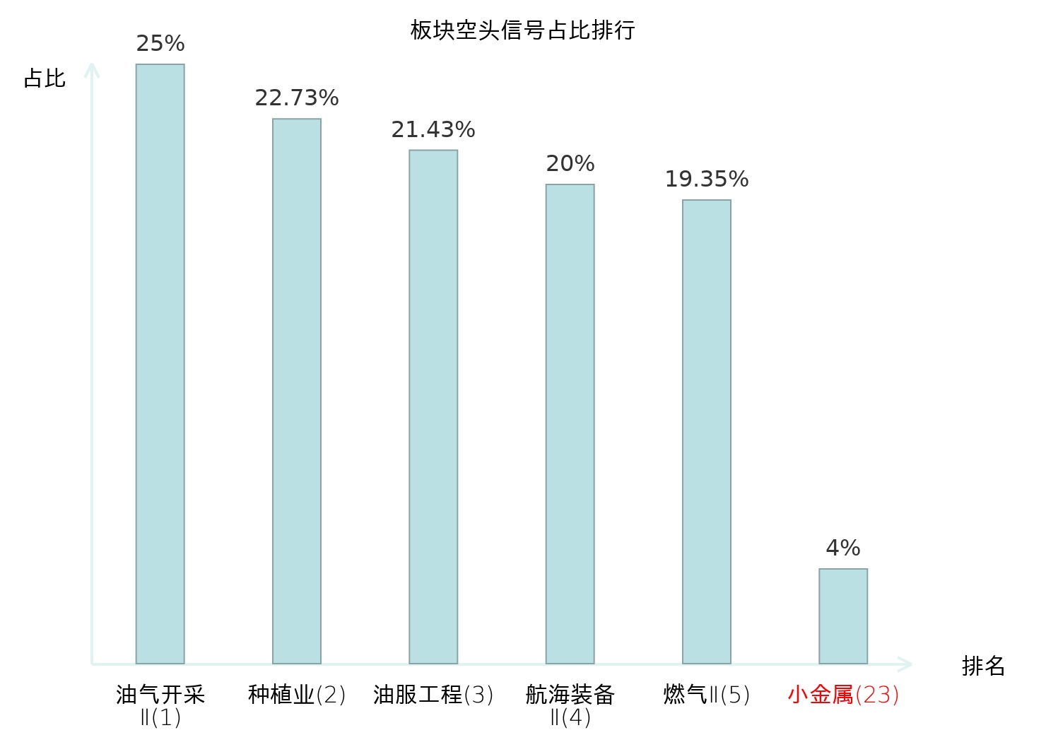 全市场所有行业板块中主力空头信号占比排名中,油气开采Ⅱ板块位居第一。专业工程板块名次提升最快,较昨日上升101位。