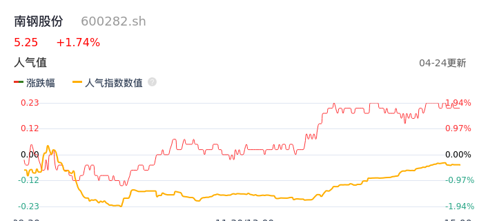 04月24日,南钢股份收报5.25,股价涨幅1.74%,成交金额1.75亿元,换手率0.55%。