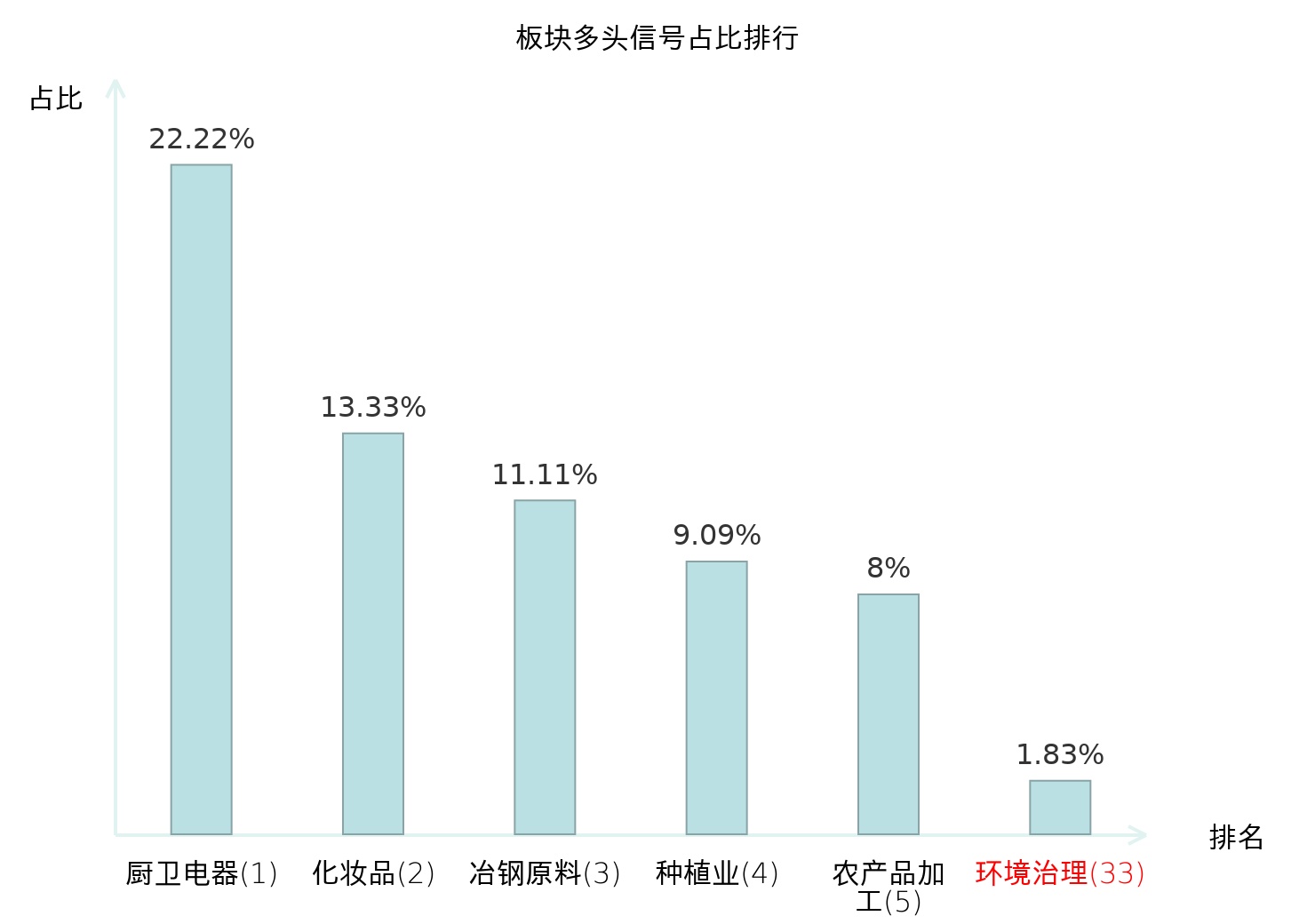 全市场所有行业板块中主力多头信号占比排名中,厨卫电器板块位居第一。化妆品板块名次提升最快,较昨日上升104位。