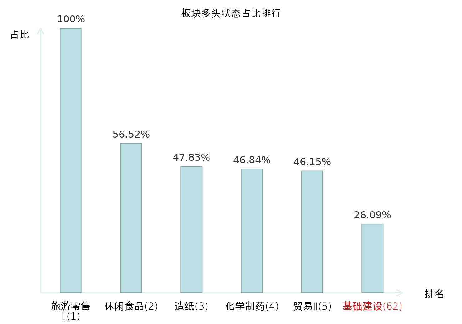 全市场所有行业板块中主力多头状态占比排名中,旅游零售Ⅱ板块位居第一。动物保健Ⅱ板块名次提升最快,较昨日上升58位。