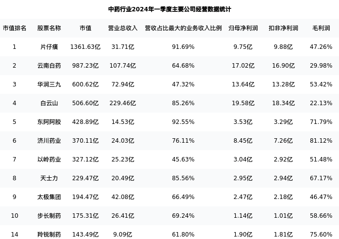 羚锐制药最新报告期数据为一季度,下表汇总了中药行业内市值靠前的公司一季度主要经营数据
