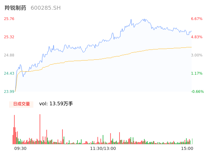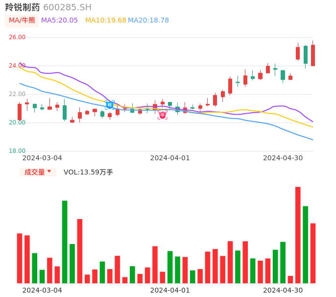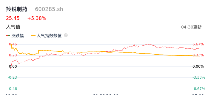 04月30日,羚锐制药收报25.45,股价涨幅5.38%,成交金额3.41亿元,换手率2.41%。