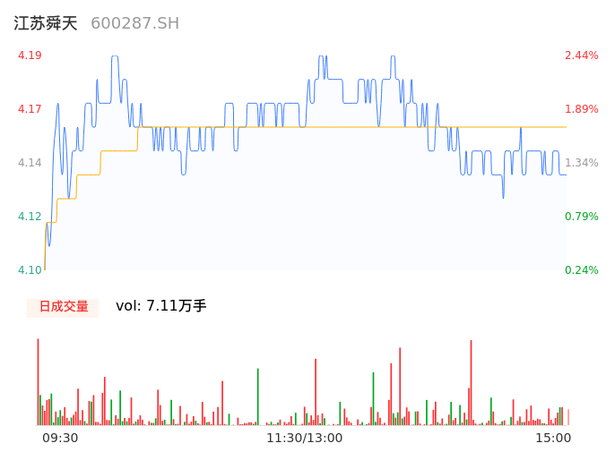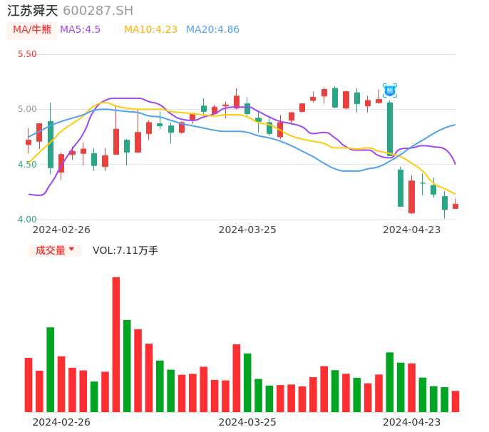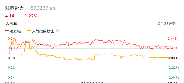 04月23日,江苏舜天收报4.14,股价涨幅1.22%,成交金额2959.06万元,换手率1.63%。