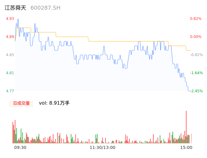 03月27日,江苏舜天收报4.78,股价涨幅-2.25%,成交金额4331.02万元,换手率2.04%。