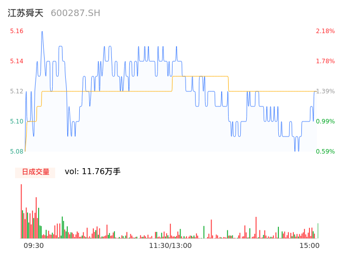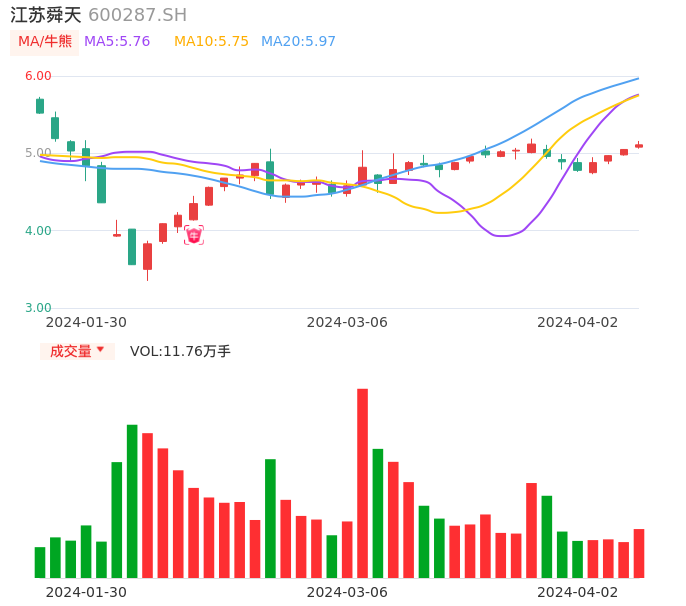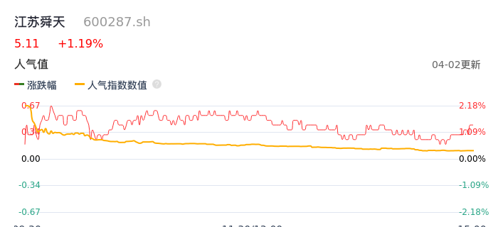 04月02日,江苏舜天收报5.11,股价涨幅1.19%,成交金额6020.85万元,换手率2.69%。