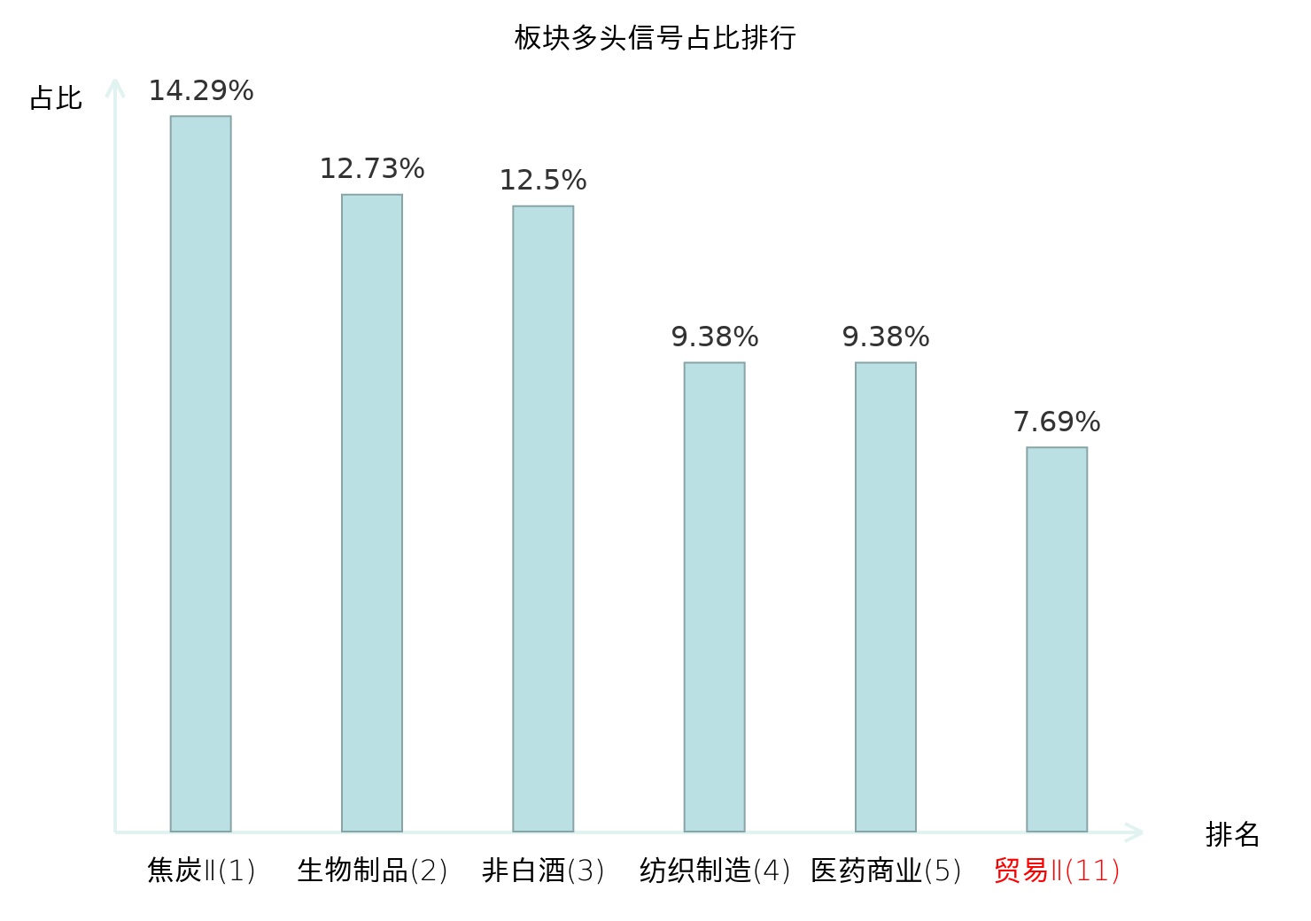 全市场所有行业板块中主力多头信号占比排名中,焦炭Ⅱ板块位居第一。焦炭Ⅱ板块名次提升最快,较昨日上升120位。