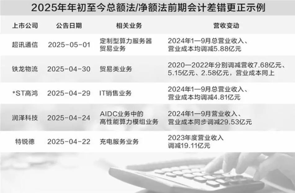 据证券时报记者不完全统计,今年以来,已有超过30家上市公司在会计差错更正相关公告中,宣布收入确认方法由总额法改为净额法,更正后收入合计调减过百亿元。