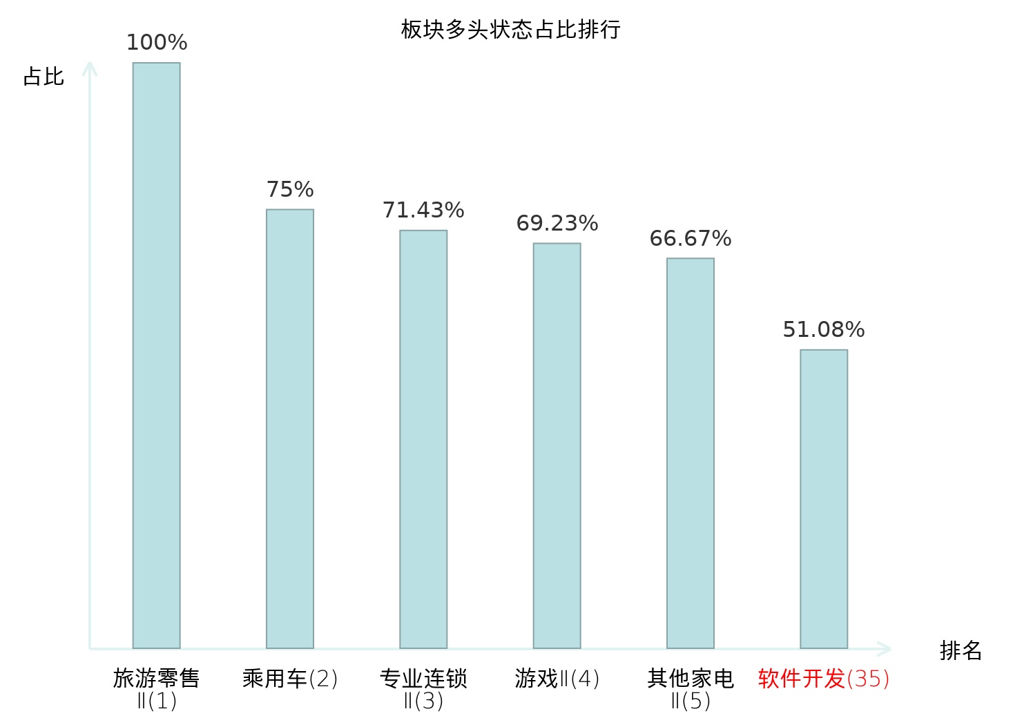 全市场所有行业板块中主力多头状态占比排名中,旅游零售Ⅱ板块位居第一。保险Ⅱ板块名次提升最快,较昨日上升82位。