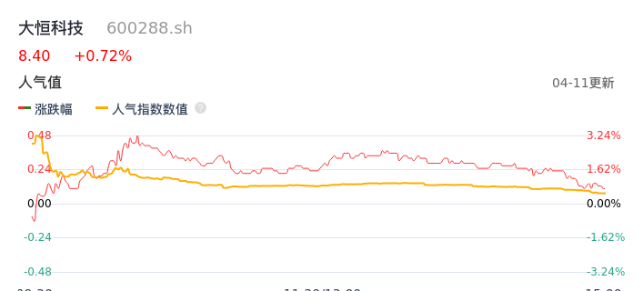 04月11日,大恒科技收报8.40,股价涨幅0.72%,成交金额1.10亿元,换手率2.97%。