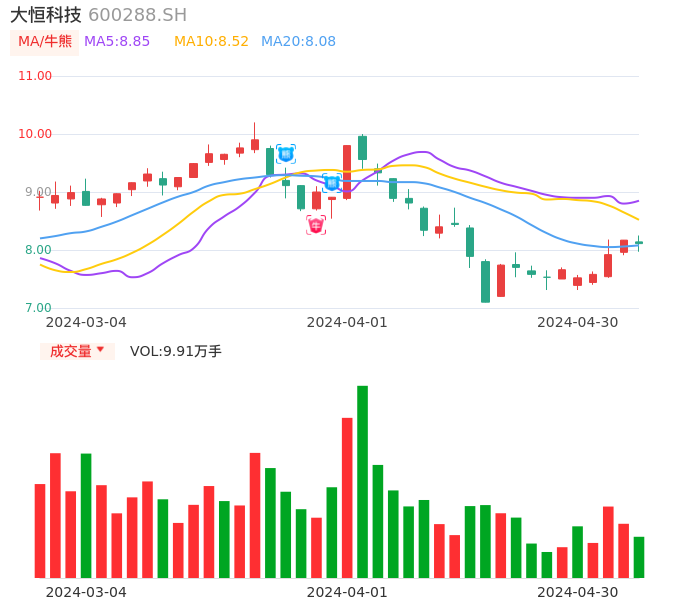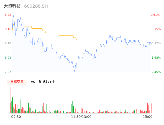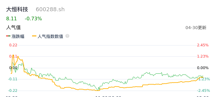 04月30日,大恒科技收报8.11,股价涨幅-0.73%,成交金额8032.01万元,换手率2.27%。