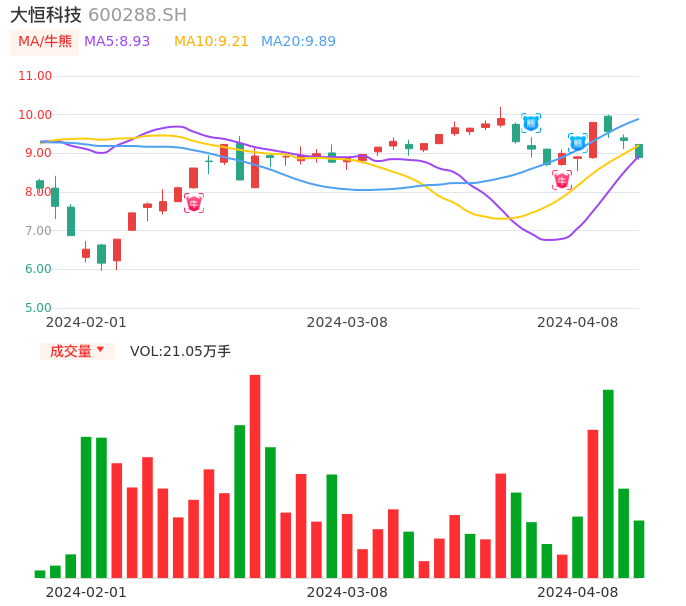 04月08日,大恒科技收报8.89,股价涨幅-4.72%,成交金额1.89亿元,换手率4.82%。