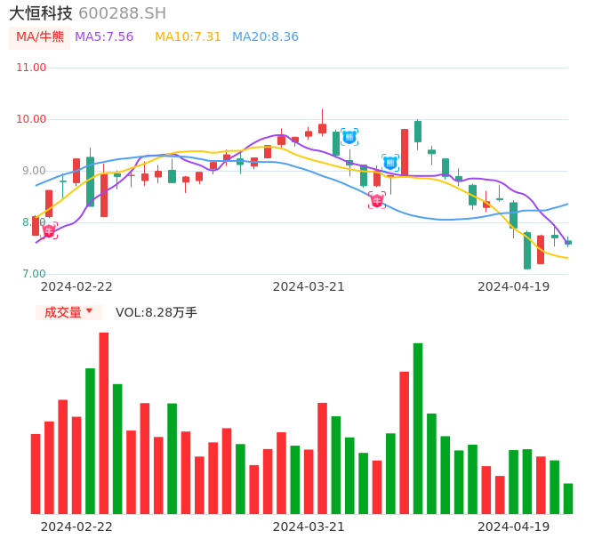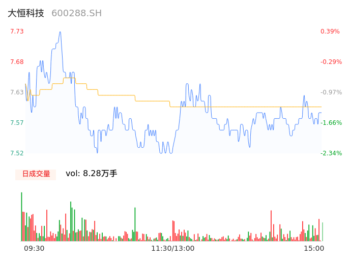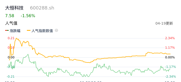 04月19日,大恒科技收报7.58,股价涨幅-1.56%,成交金额6289.77万元,换手率1.90%。