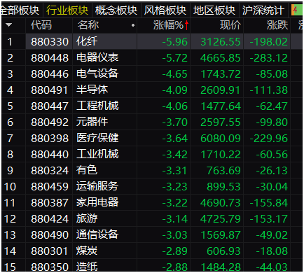 行业板块方面,绝大多数下跌,化纤、电器仪表、电气设备、半导体、工程机械等板块跌幅居前。