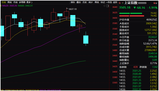 上证指数开盘直接跌破20日线,全天低位运行,午后扩大跌幅,盘中一度下跌超过70点。截至收盘,上证指数下跌68.18点,跌幅1.91%,创出2020年7月24日之后,近半年最大单日跌幅。