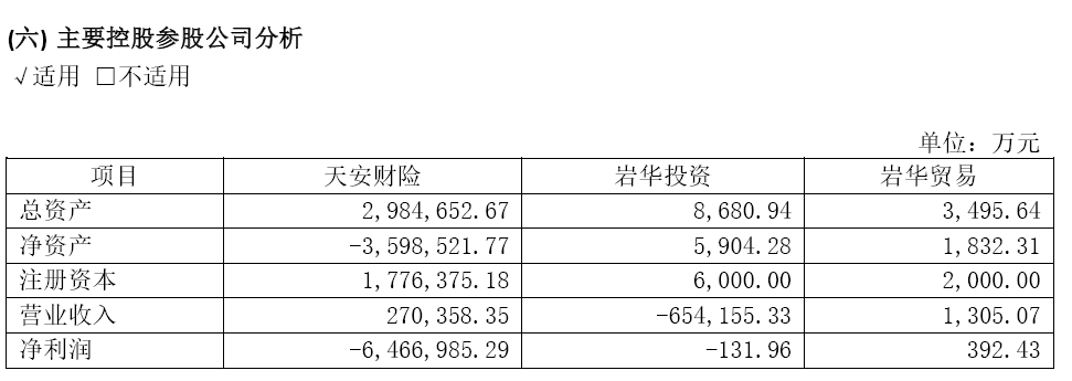 从西水股份主要控股参股子公司情况来看,上半年天安财险净亏损达到646.7亿元,净资产为-359.85亿元。可以说,天安财险已经处于严重资不抵债状态。