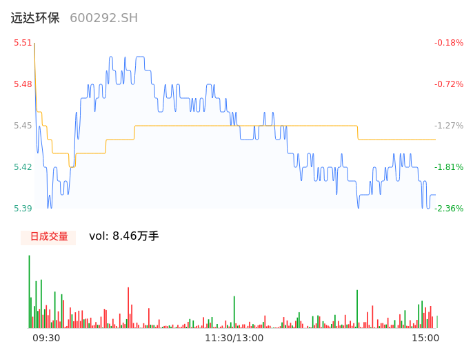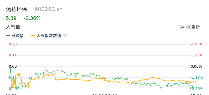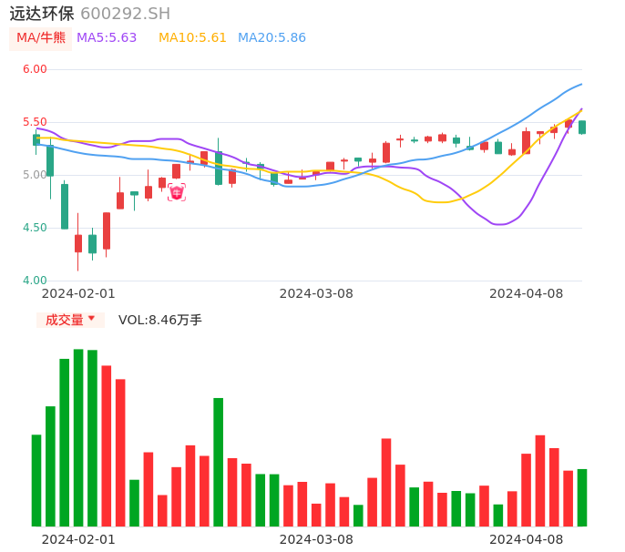 04月08日,远达环保收报5.39,股价涨幅-2.36%,成交金额4598.35万元,换手率1.08%。