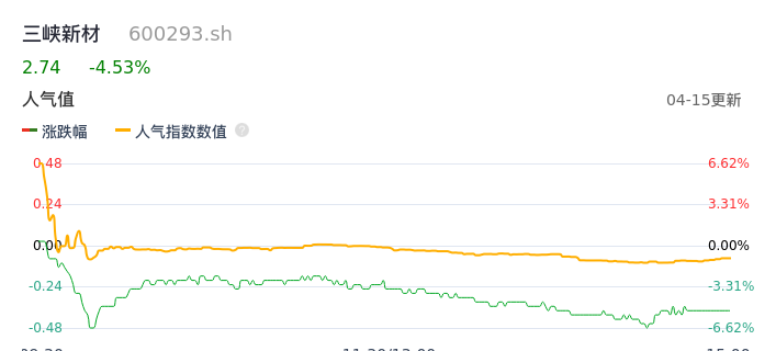 04月15日,三峡新材收报2.74,股价涨幅-4.53%,成交金额5490.05万元,换手率1.72%。