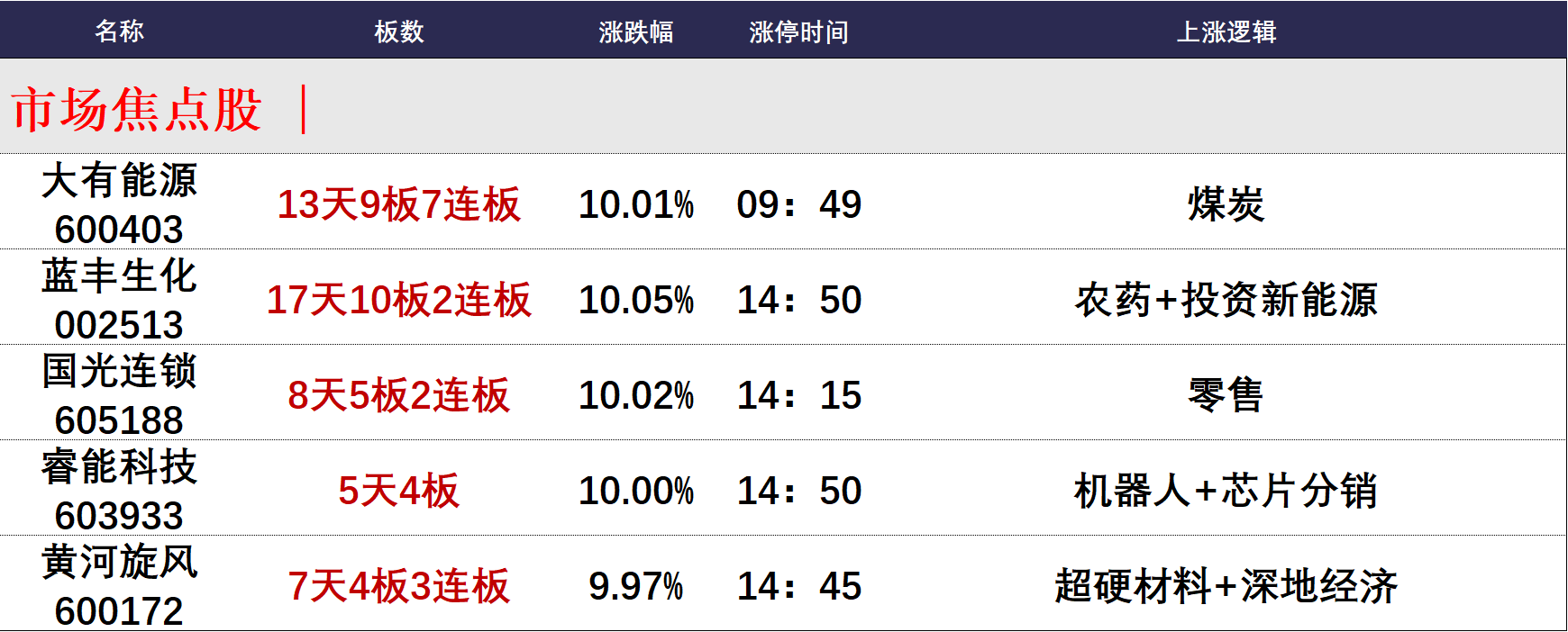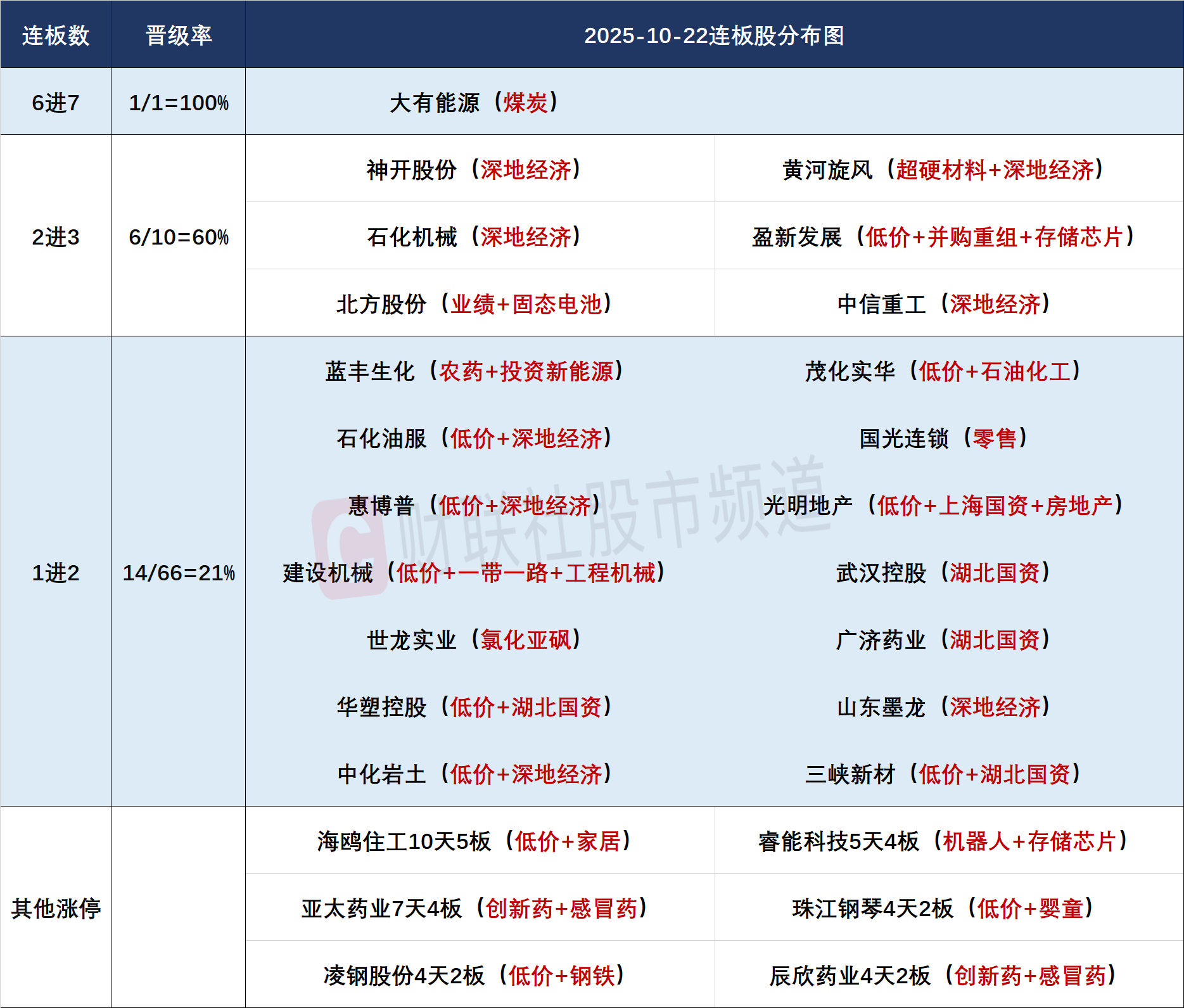 个股方面,大有能源缩量加速晋级7连板,继续向上拓展连板空间。受深地经济与湖北国资概念持续走强影响,连板股晋级率大幅回升,深地经济概念股黄河旋风、神开股份、石化机械、中信重工晋级3连板,湖北国资股武汉控股、广济药业、三峡新材、华塑控股晋级2连板。此外,低价股表现活跃,21只连板股中仅4只股价超过10元。