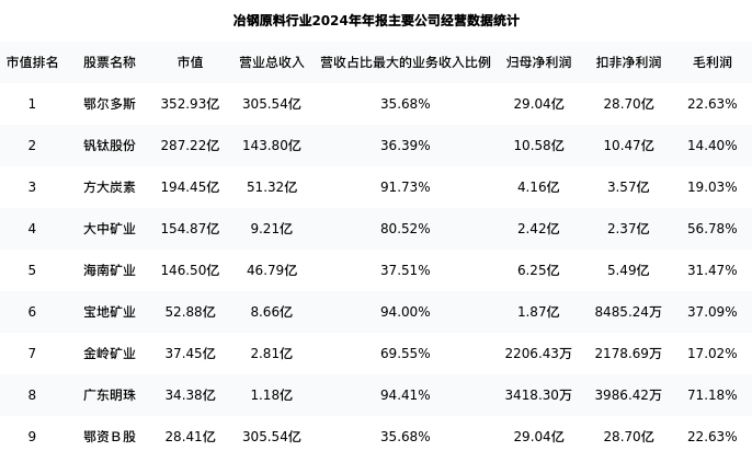 鄂尔多斯最新报告期数据为年报,下表汇总了冶钢原料行业内市值靠前的公司年报主要经营数据