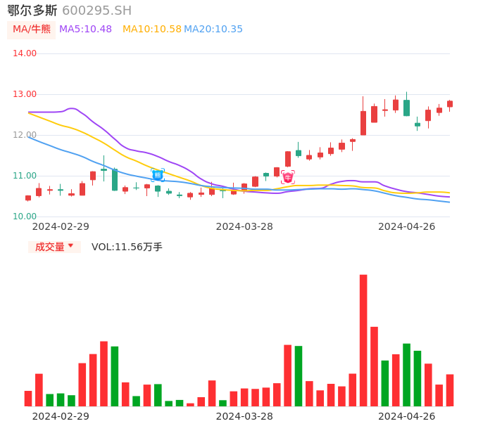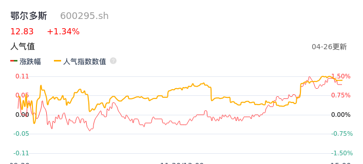 04月26日,鄂尔多斯收报12.83,股价涨幅1.34%,成交金额1.47亿元,换手率0.59%。