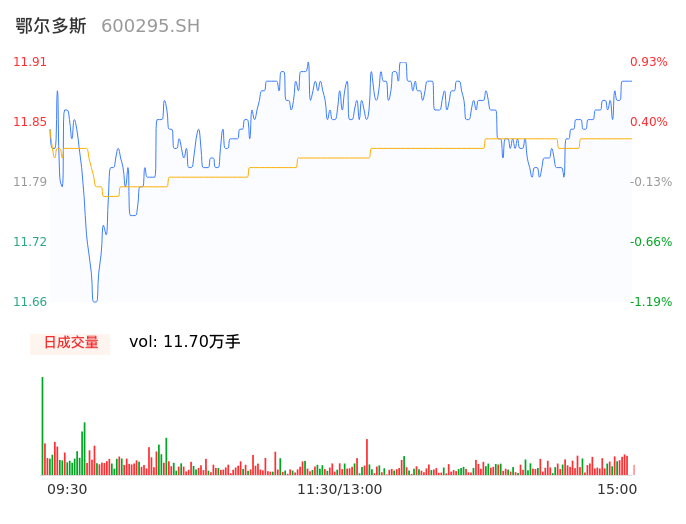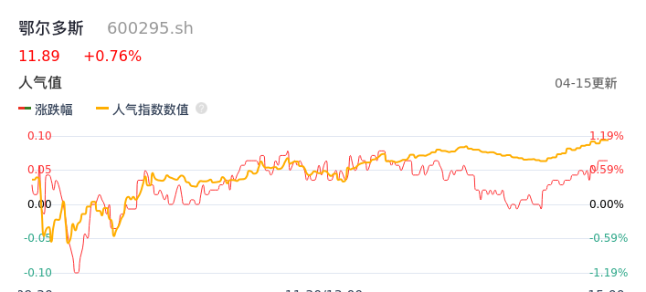 04月15日,鄂尔多斯收报11.89,股价涨幅0.76%,成交金额1.38亿元,换手率0.59%。