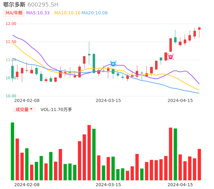 鄂尔多斯在4月3日出现日线级别牛点,与60分钟牛点形成共振,目前还未完全进入快速上涨通道,注意上方指标压力位:13.51元,如有效突破可积极关注。