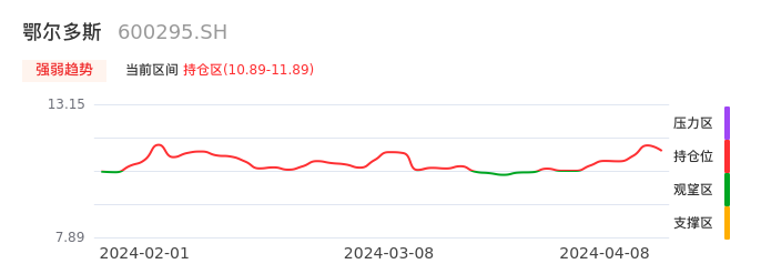 我们来看一下该股的九方特色指标强弱趋势的情况:鄂尔多斯自03月25日从观望区上穿到持仓区。股价近期在多头区域回调整理。后续重点关注多空分界点的争夺:10.89元。如未能有效站稳则可能重新回到空头行情。