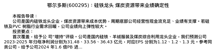 值得注意的是:2024年03月国泰君安的李鹏飞/魏雨迪/王宏玉分析师,首次发布关于鄂尔多斯的研究报告,标题为:鄂尔多斯(600295):硅铁龙头 煤炭资源带来业绩确定性。