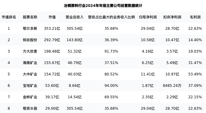 鄂尔多斯最新报告期数据为年报,下表汇总了冶钢原料行业内市值靠前的公司年报主要经营数据