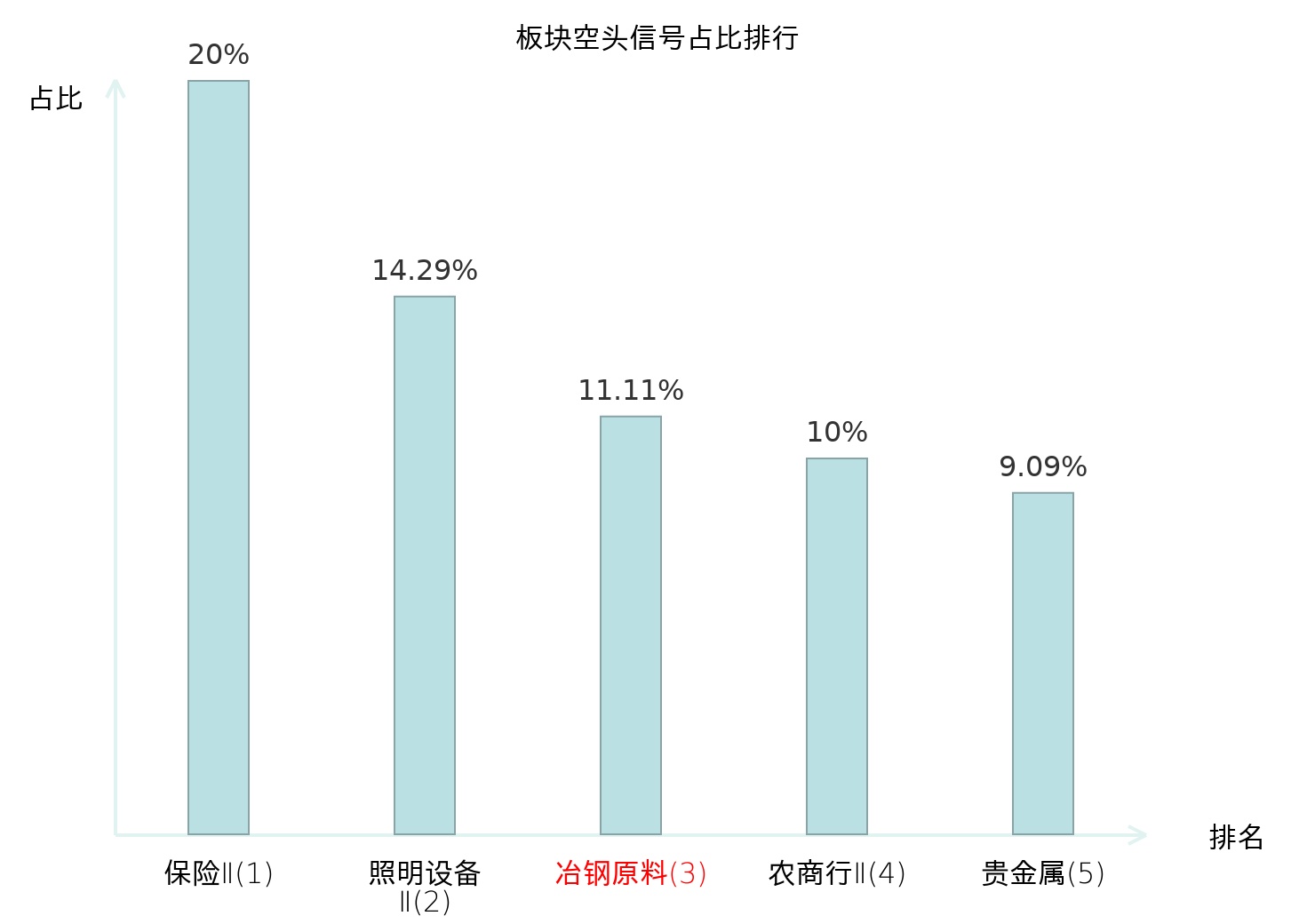 全市场所有行业板块中主力空头信号占比排名中,保险Ⅱ板块位居第一。医药商业板块名次提升最快,较昨日上升103位。