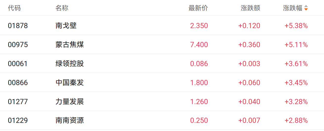 高温天气调整电煤需求,带动港股煤炭股普涨。截至发稿,南戈壁(01878.HK)涨5.38%、蒙古焦煤(00975.HK)涨5.11%、中国秦发(00866.HK)涨3.45%、南南资源(01229.HK)涨2.88%。