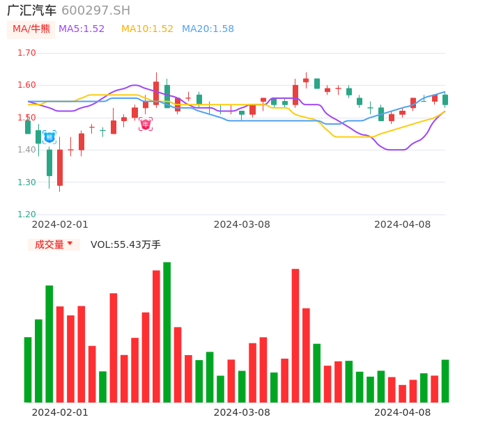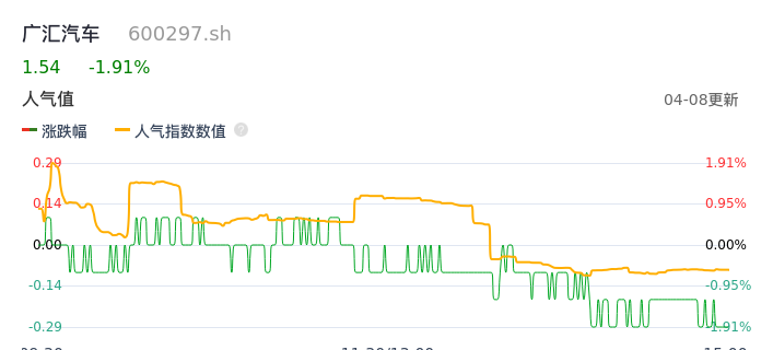 04月08日,广汇汽车收报1.54,股价涨幅-1.91%,成交金额8649.91万元,换手率0.68%。