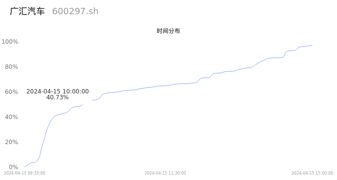 600297广汇汽车2024年04月15日成交75.76万手,成交金额1.12亿元,相较昨日放量40.20万手,换手率0.93%,成交清淡。