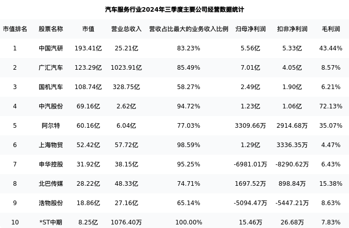 广汇汽车最新报告期数据为三季度,下表汇总了汽车服务行业内市值靠前的公司三季度主要经营数据