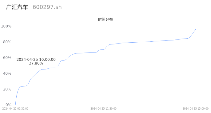 600297广汇汽车2024年04月25日成交65.54万手,成交金额9123.72万元,相较昨日放量28.44万手,换手率0.81%,成交清淡。