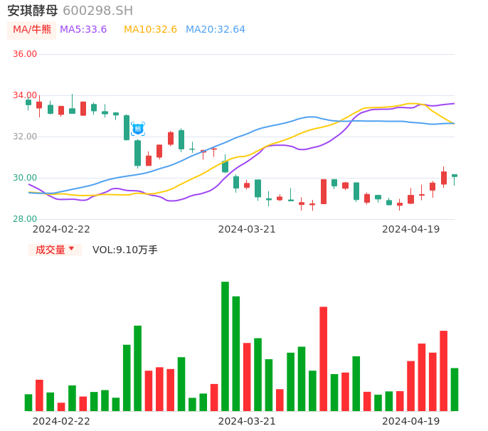 04月19日,安琪酵母收报30.06,股价涨幅-0.76%,成交金额2.72亿元,换手率1.05%。