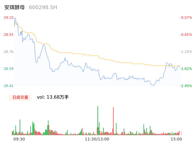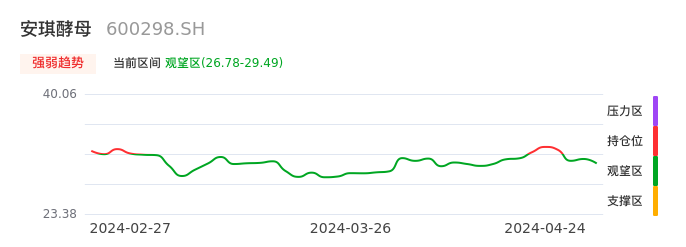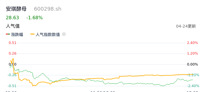 04月24日,安琪酵母收报28.63,股价涨幅-1.68%,成交金额3.91亿元,换手率1.58%。