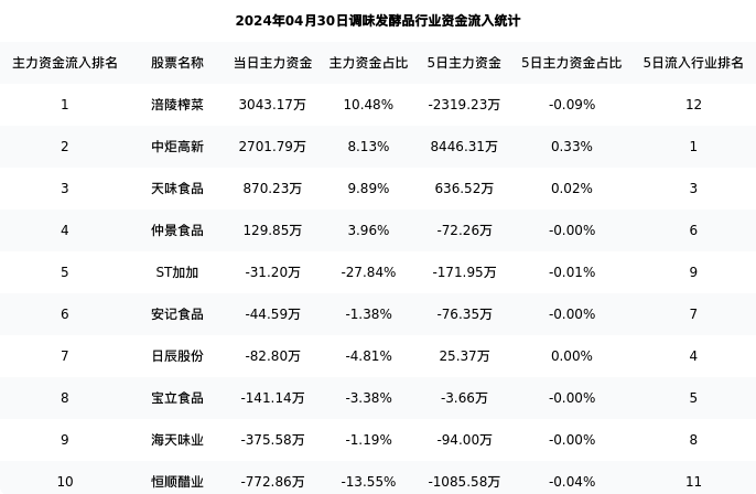 从主力资金流向来看,调味发酵品行业今日主力资金流入6.86亿元,在所有申万二级行业中排名:103/131。