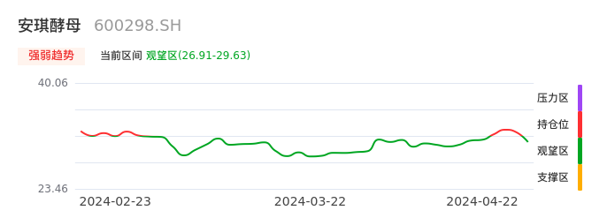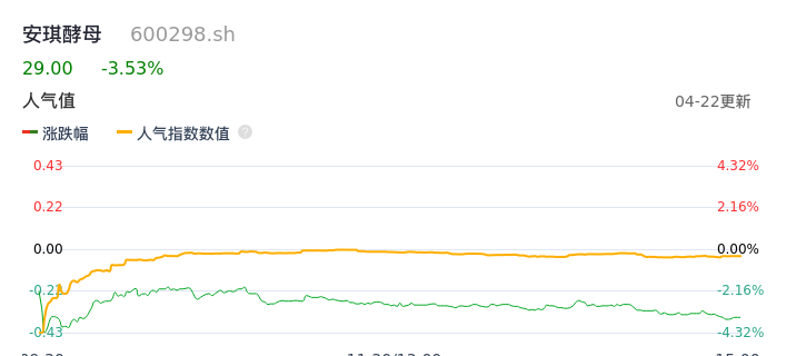 04月22日,安琪酵母收报29.00,股价涨幅-3.53%,成交金额3.57亿元,换手率1.42%。