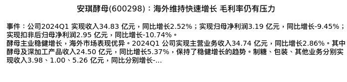 值得注意的是:2024年04月中泰证券的分析师,首次发布关于安琪酵母的研究报告,标题为:安琪酵母(600298):海外维持快速增长 毛利率仍有压力。