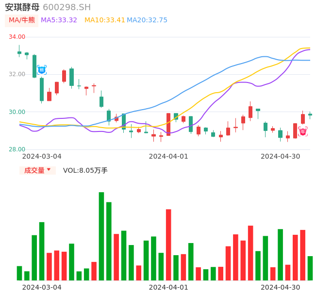 04月30日,安琪酵母收报29.82,股价涨幅-0.17%,成交金额2.40亿元,换手率0.93%。
