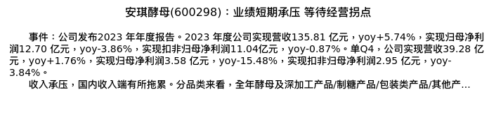 值得注意的是:2024年03月德邦证券的熊鹏/韦香怡分析师,首次发布关于安琪酵母的研究报告,标题为:安琪酵母(600298):业绩短期承压 等待经营拐点。