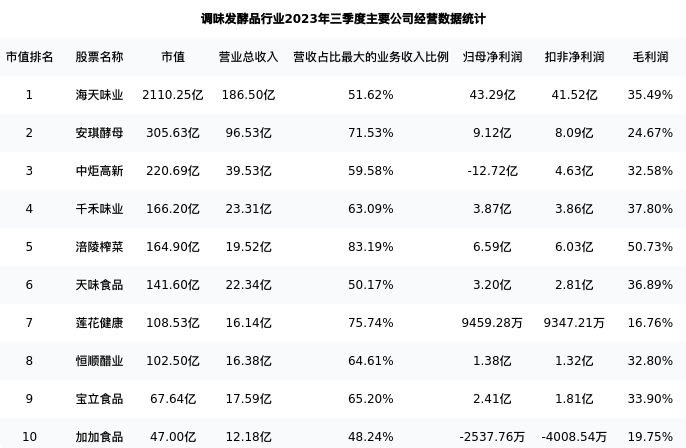 安琪酵母最新报告期数据为三季度,下表汇总了调味发酵品行业内市值靠前的公司三季度主要经营数据