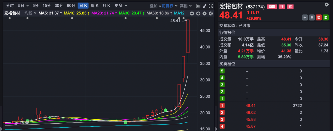 9月3日,安琪酵母控股子公司宏裕包材再度强势涨停,这是该股连续第三天实现30%涨停。自9月1日起,宏裕包材的股价便开启“暴走”模式,每股价格从22元附近飙升至超过48元,短短3个交易日已经翻倍。资深新三板评论人、北京南山投资创始人周运南认为,宏裕包材连续3日斩获“30cm”涨停板,迅速火遍全巿场,背后或有多重利好因素共振,一方面可能受益于半年报业绩高速增长,而且作为国资背景的小市值公司,其在市场中本就具备一定吸引力;另一方面,公司的业务新涉及新能源电池隔膜领域,正好契合当下市场热点而被投资者挖掘,成功吸引资金涌入。业绩方面,2025年上半年,该公司实现营业收入3.21亿元,同比增长5.5%;归母净利润达1221万元,同比大幅上升147.4%;扣非后归母净利润更是增长996.5%,达到941万元;经营活动现金流也明显改善,从-185万元转为1.23亿元。宏裕包材表示,公司净利润增长源于彩印复合包装产品销量增加带来的收入增长,以及产品和客户结构变化致使毛利率上升,而扣非净利润大幅增长显示出公司核心业务盈利能力增强,盈利质量提升。在经营策略上,宏裕包材加快了新领域和国际市场的开发,特别是与外资食品知名企业的合作,推动了国外销售收入的增长。此外,公司在参加各类行业展会中提升了品牌知名度,进一步巩固了市场地位。在重大项目建设上,2025年上半年,宏裕包材加快了年产3万吨健康产品包装材料智能工厂二期项目的建设,主体设备干式复合机、柔版印刷机及DCTX-CSR溶剂回收系统已投入试运行。宏裕包材表示,公司作为华中地区规模靠前的包装生产企业,虽具备一定的产品规模、产品质量和服务优势,但整体市场份额仍有待进一步提升。公司将紧跟市场需求,积极推动产品创新,加强技术研发,提升技术实力;继续坚持聚焦食品、日化、卫材等下游产业,加大市场推广和营销力度,开发新的市场渠道。在互动平台上,投资者对宏裕包材的海外业务增长颇为关注。公司回应称,2023年—2024年度,公司海外销售收入增长率分别为22.95%、15.28%。目前,通过联合技术创新与解决方案合作开发,公司在高端食品包材领域已获得部分外资品牌客户认可,为后续合作筑牢基础。未来,宏裕包材计划提升国际业务开发小组的攻坚能力,完善海外技术服务保障体系,进一步推动海外业务份额稳步增长。资料显示,宏裕包材主营业务为彩印复合包材产品、注塑产品、吹膜产品和新材料产品的研发、生产、销售,重点围绕食品、医药、日化等领域,研发、生产及销售塑料彩印复合膜(袋)、食品级注塑容器及新型包装材料。该公司与安琪酵母渊源颇深,自1998年起便展开合作,2010年成为安琪酵母控股子公司,后者持有其48.75%的股份,实际控制人为宜昌市国资委。2023年8月,宏裕包材成功登陆北交所,有湖北省“A拆北”第一股之称,此次股价的强势表现,再次让其成为资本市场焦点。北交所股票连板的现象并不鲜见。此前在7月21日至7月24日,恒立钻具曾成功实现四连板,展现出强大的赚钱效应。周运南认为,连板行情体现了北交所30%涨幅空间的巨大优势,体现北交所短线的赚钱效应,从而激发市场信心和市场流动性,推动北交所行情发展,“但同时我要提醒投资者,股市追高有风险。”