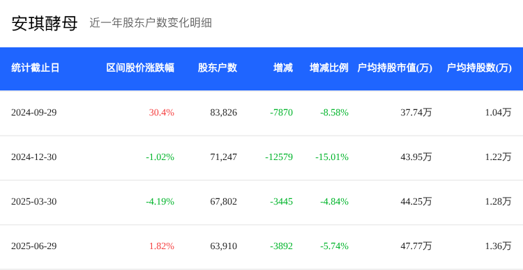 2025年第二季度,安琪酵母(600298)的股东户数为6.39万,相比2025年第一季度减少了5.74%,股东户数的减少表明部分投资者可能在这一时期选择了退出。与此同时,户均持股数量环比增长了6.03%,达到约14,398股,户均持股市值也增加了7.96%,达到了47.77万元。这表明留下的投资者持有的股份更加集中,可能更加看好公司的长期发展前景。