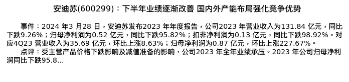 值得注意的是:2024年04月长城证券的肖亚平分析师,首次发布关于安迪苏的研究报告,标题为:安迪苏(600299):下半年业绩逐渐改善 国内外产能布局强化竞争优势。