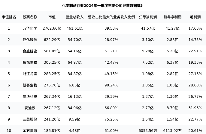 安迪苏最新报告期数据为一季度,下表汇总了化学制品行业内市值靠前的公司一季度主要经营数据