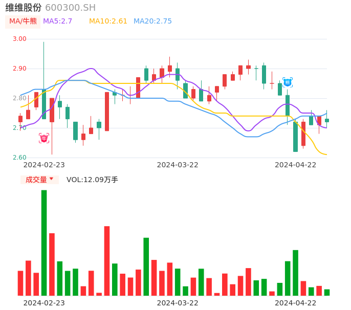 04月22日,维维股份收报2.72,股价涨幅-0.73%,成交金额3307.27万元,换手率0.75%。